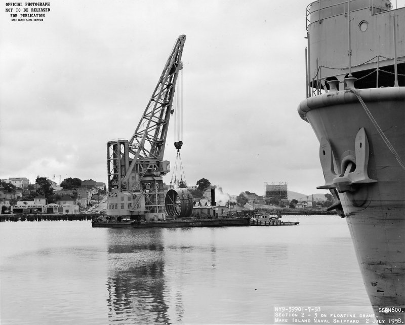 YD-33 transporting a hull section of SSGN-600 (later Theodore Roosevelt (SSBN-600) from berth 15 to the building ways at Mare Island, 2 July 1958. The bow of USS ARD-32 is at right. Mare Island Naval Shipyard photo # 39901-7-58 |