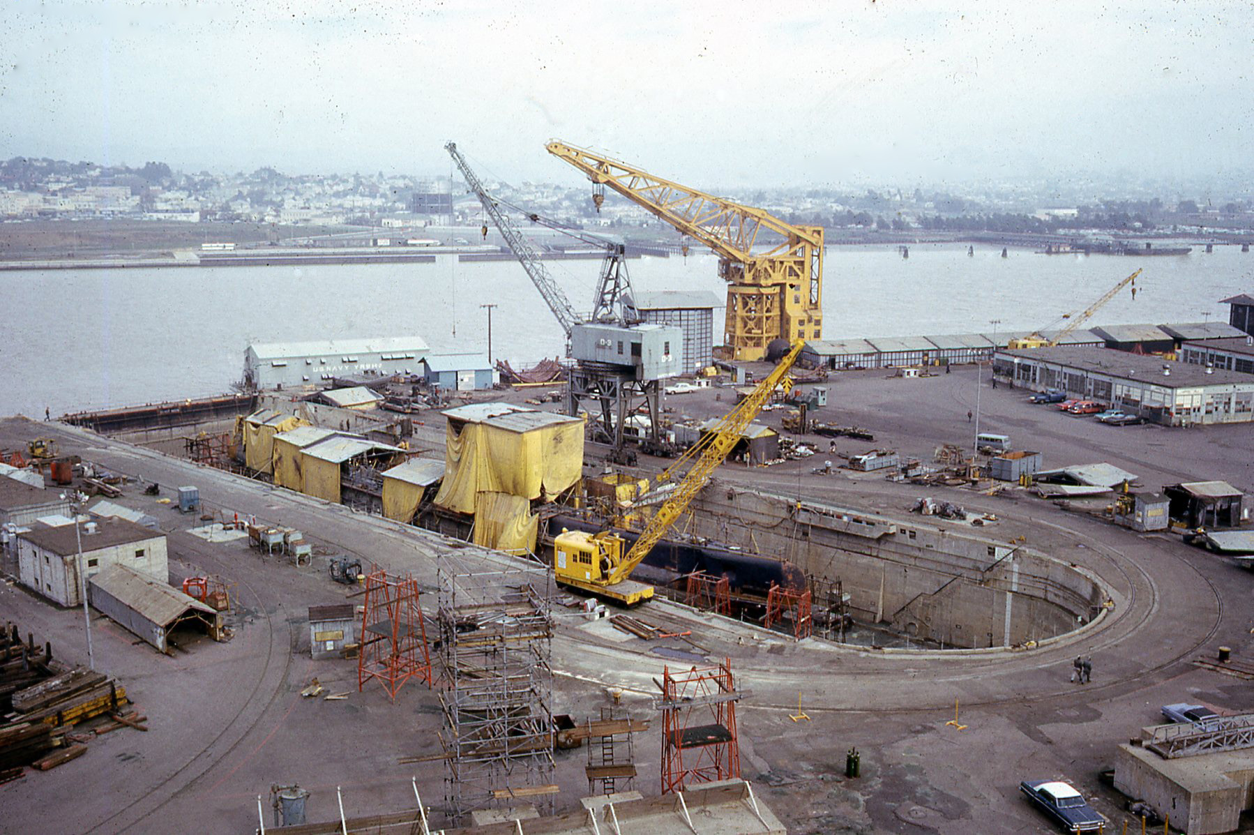 YD-33 and YRB-20 in the background of this photo of USS Caiman (SS-323) in Mare Island's dry dock #4 in February 1967 while in overhaul at the yard. File name: 2-80 SS 323 DD#4 Feb 67, Navy Photo, Feb. 1967 | Darryl Baker | ||