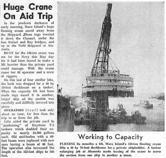 Shipyard newspaper "The Grapevine" article from the 26 May 1961 issue "Huge Crane on Aid Trip." Describes YD-33 performing a 150 ton lift at Todd Shipyard at Alameda | Darryl Baker | ||