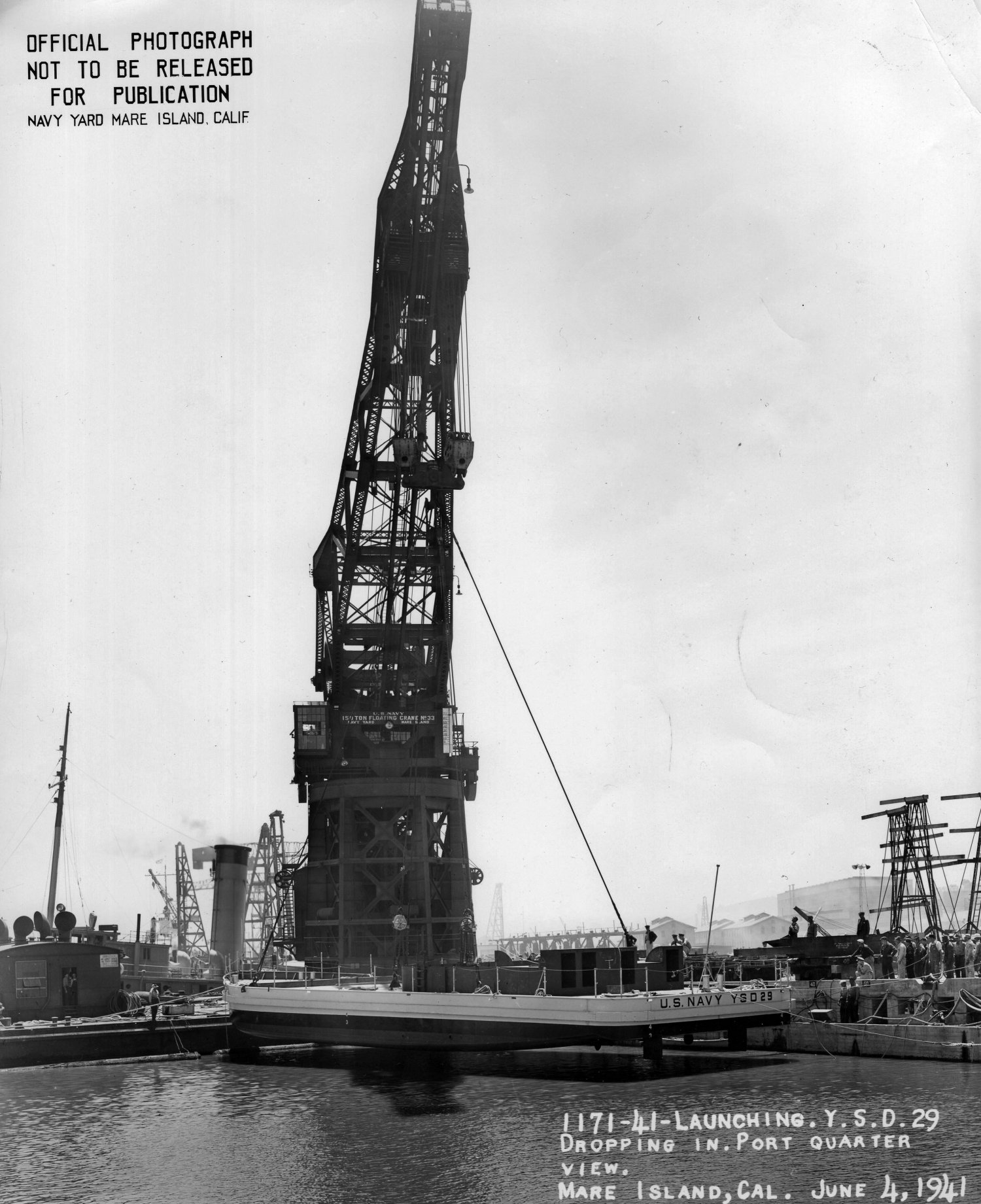 377k | Launching of YSD 29 by YD 33 at Mare Island Navy Yard, 4 June 1941. The tug Cahokia (YTB-135) is in the background alongside YD 33. US Navy photos courtesy of Vallejo Naval and Historical Museum. |