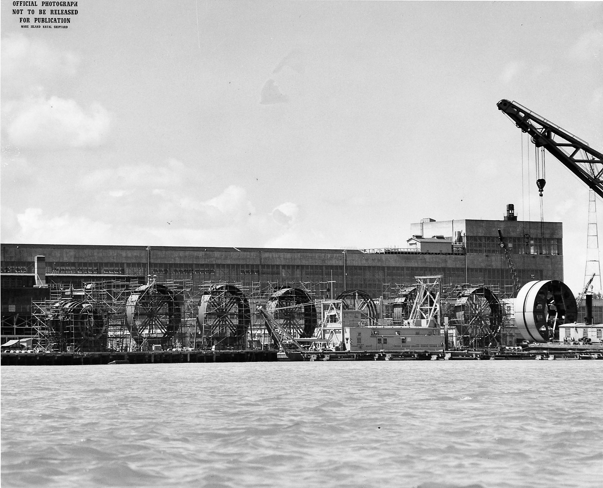 425k | Aerial view of the south end of Mare Island Naval Shipyard, between 12 and 19 September 1946. Ships present include: