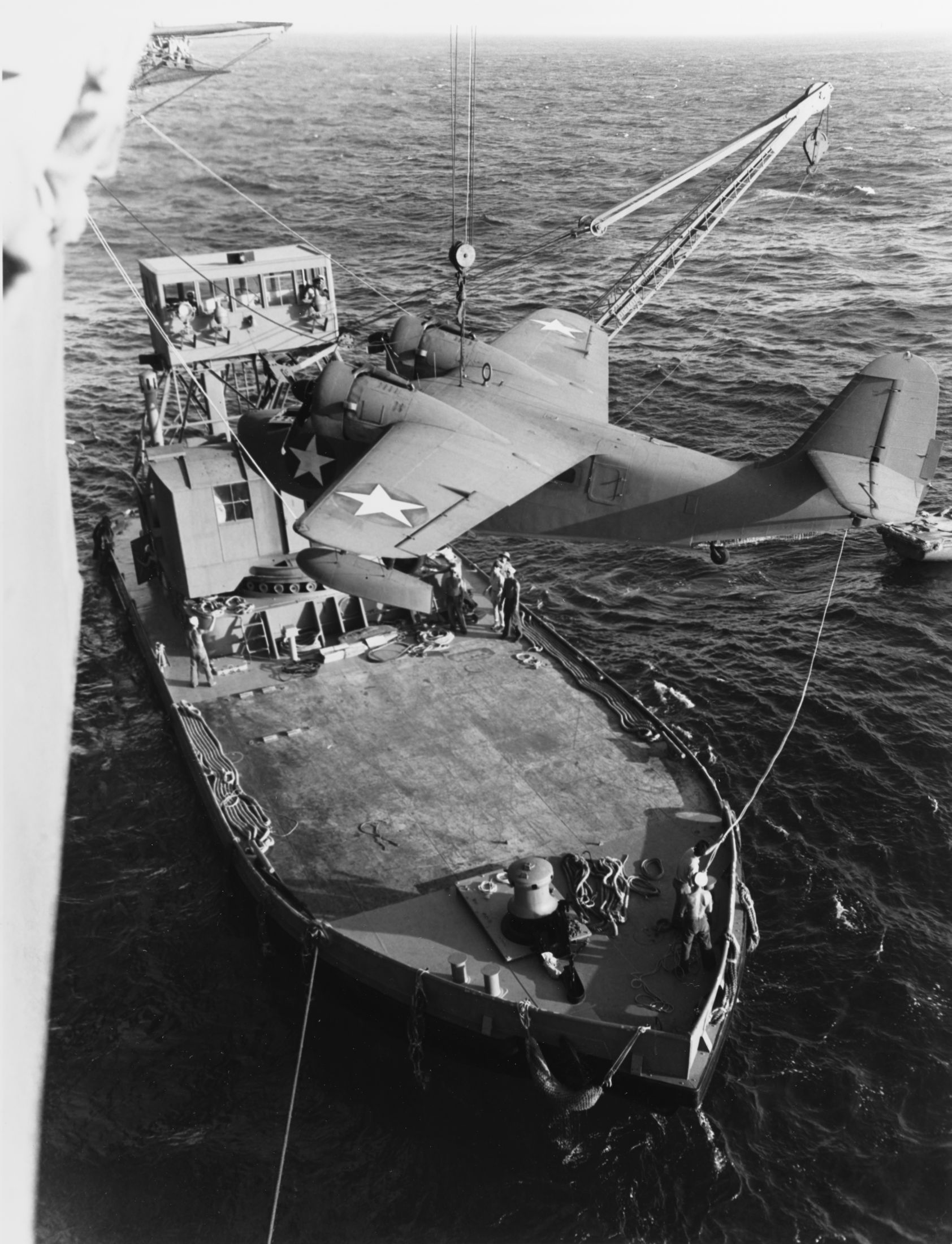 75k | YSD-30 receives a Grumman JRF Goose from USS Long Island (ACV-1) at Palmyra, 19 April 1943.