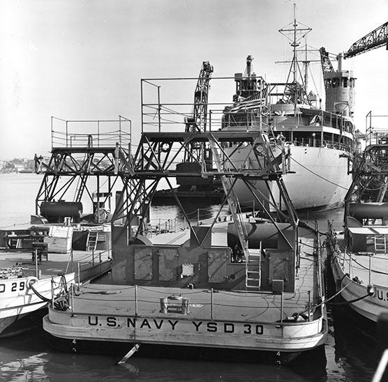 121k | YSD-30 painted in what appears to be the peacetime white and spar color, with her designation in black on her hull, fits out at the Mare Island Navy Yard, 01 October 1941, flanked by sister craft YSD-29 (left) and YSD-31 (right). YSD-30’s crane is yet to be fitted, and bridge is still unenclosed as this stage. The new submarine tender USS Fulton (AS-11), commissioned since 12 September 1941, fits out in the background. US Navy Bureau of Ships photo, National Archives & Records Administration, Still Pictures Branch, College Park, MD. |