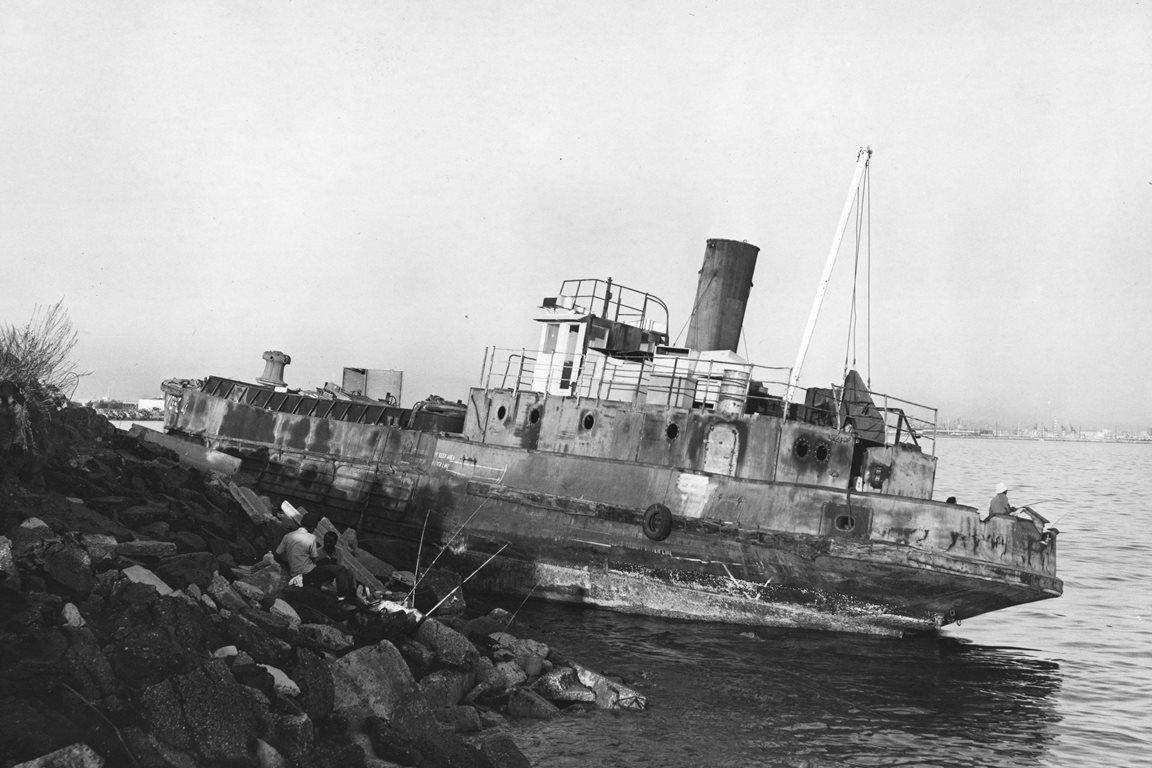 Hulk of YG-34 on 08 December 1974, after blowing ashore at Terminal Island, CA, four days earlier. Note the fisherman on the stern taking advantage of the situation. Photo copyright George Schneider |