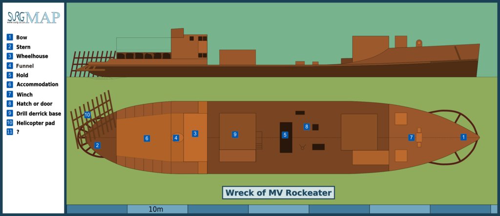 54k | General arrangement sketch of the wreck of the MV Rockeater, False Bay, Cape Peninsula. May 2011.