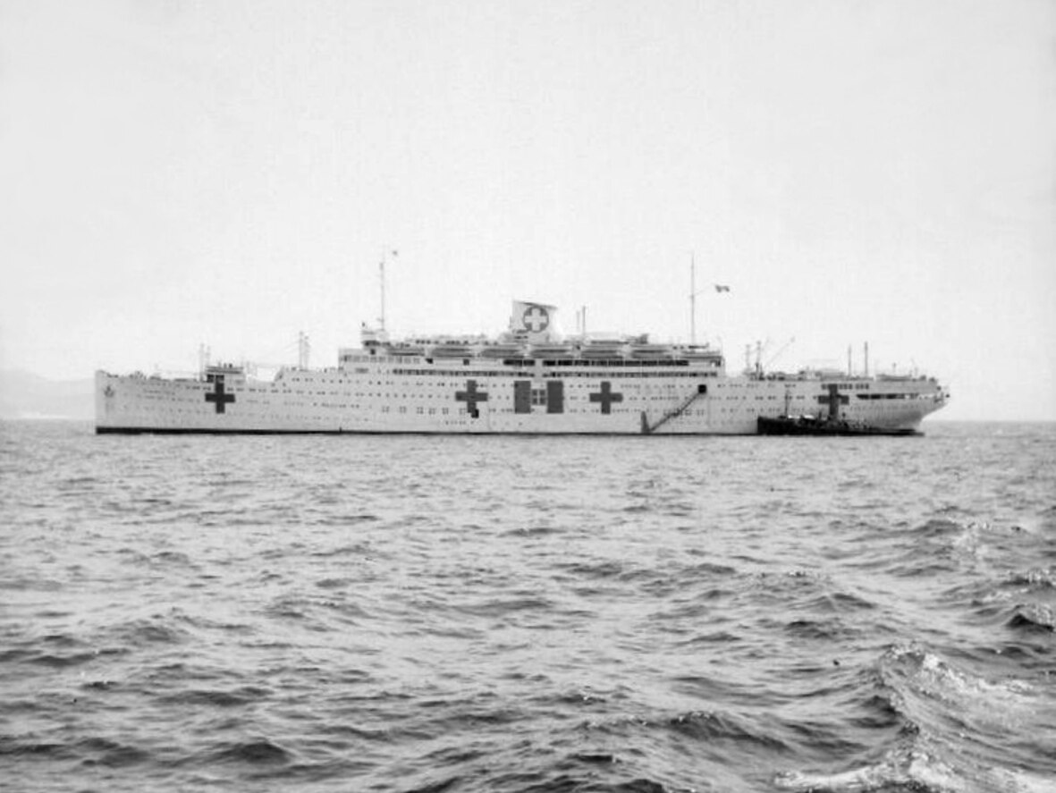77k | USAHS Frances Y. Slanger moored pierside at New York Port of Embarkation, Brooklyn, 1945.