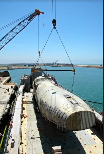 65k | The 170-foot-long, 25-foot-high fuselage of a C-17 cargo aircraft is lifted onto Army transport ship USAV SSGT Robert T. Kuroda (LSV-7)