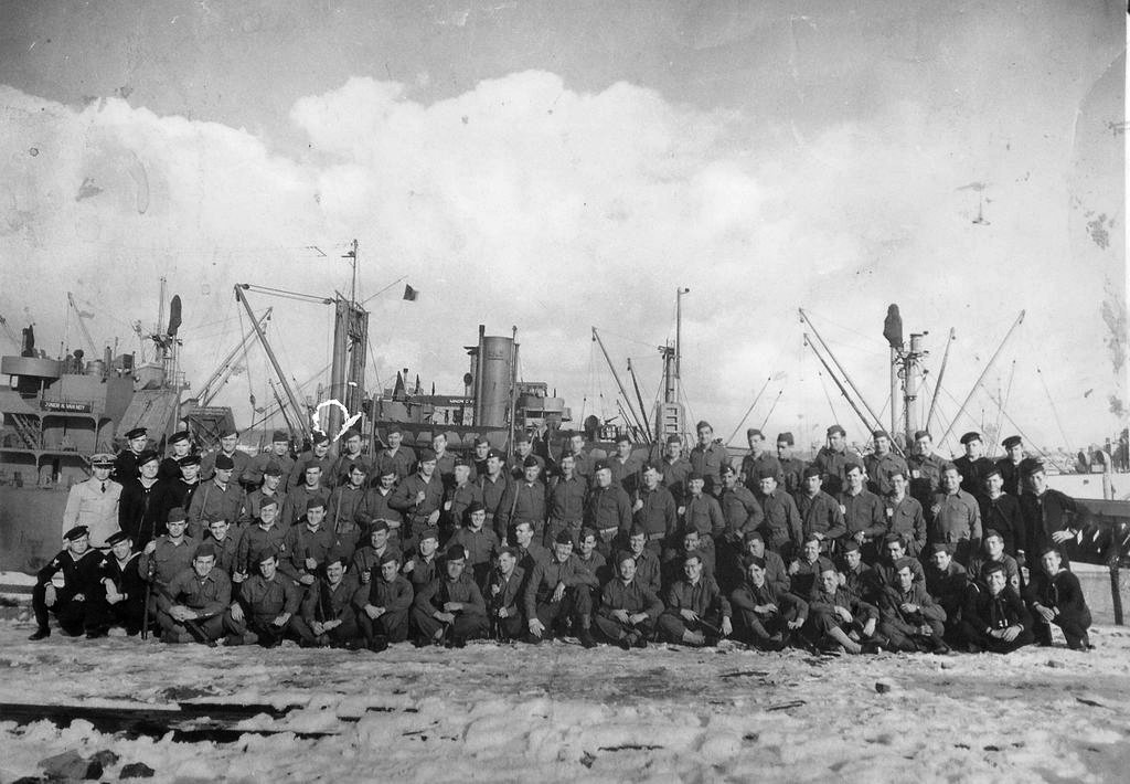 The sixty member 1071st Engineer Port Repair Ship crew of USAPRS Junior N. Van Noy at Cherbourg, circa 1944