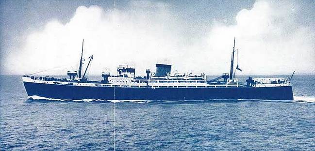 38k | Pictured here is one of the sister ships MV Aconcagua, MV Copiapo or MV Imperial (7,237, 7,279 and 7,279 get, 440 ft. long). These Chilean Line vessels were built in 1937-38, and taken over by the U.S. as troop ships in 1943. | John Spivey | |