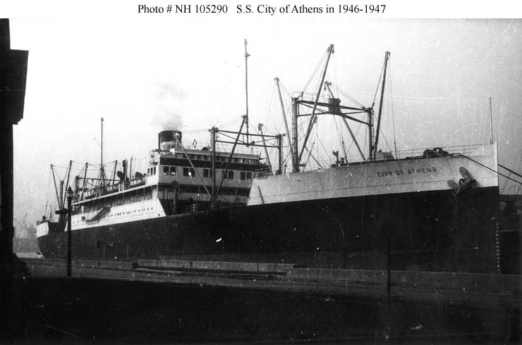 Ex- USAT Cantigny wearing the name SS City of Athens while under uncertain ownership in 1946 and 1947.