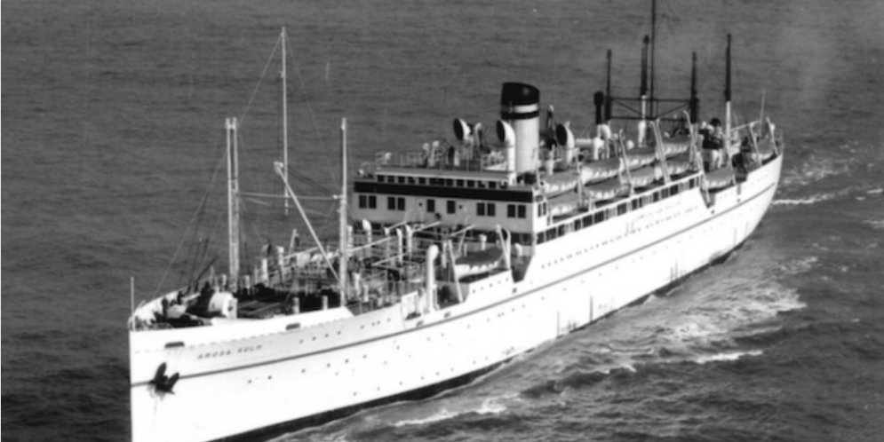 Ex-USAT Cantigny as the Panama flagged Arosa Lines SS Arosa Kulm underway, circa 1952-1958, location unknown.