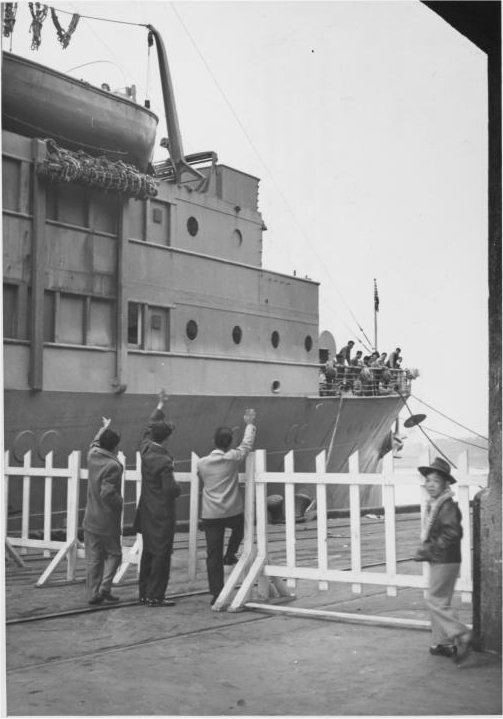 Shawnee 56k A group of A group of Los Angeles Nisei bid farewell to old friends, 30 November 1946, aboard the SS Shawnee, detailed to return persons of Japanese ancestry, evacuated from Hawaii during the war, to their former homes.