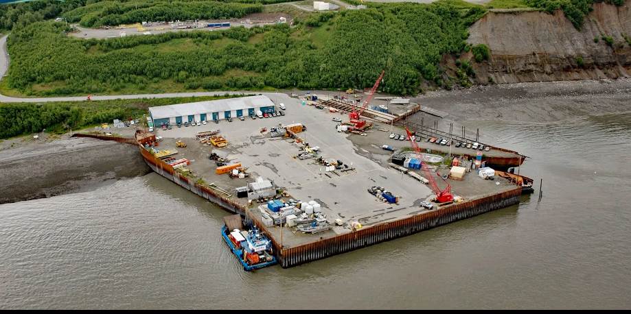 87k Arness Dock, Nikiski Bay, Alaska. Hulls of SS Howell Cobb and SS Edward A. Filene are visible as part of the dock.