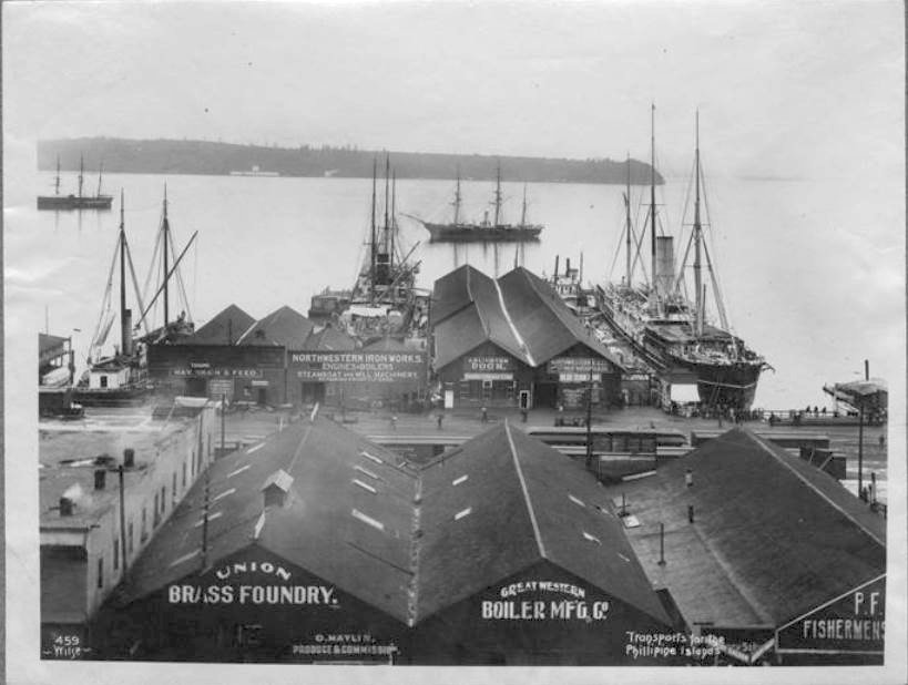 USAT Garonne (left) and USAT Athenian (right) docked at Elliott Bay, Seattle in August 1899 while loading horses,