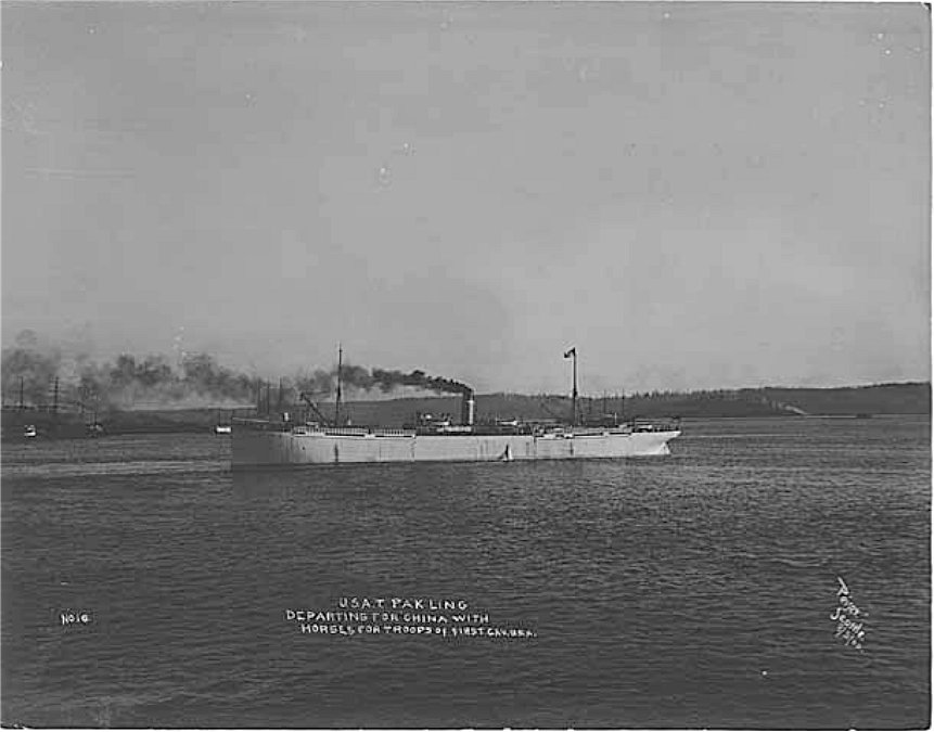 73k USAT Pak Ling transporting U.S. troops and horses out of Seattle en route for China, 5 August 1900