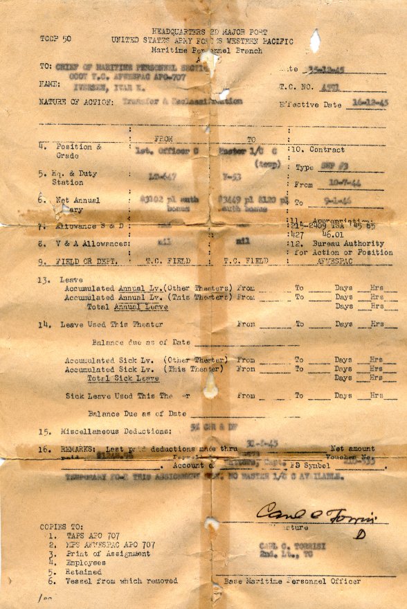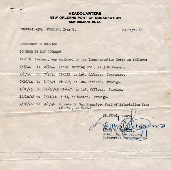 Statement of Service for Ivar Kristian Iversen (Norwegian)- From February 1944 Ivar Iversen was employed in US Army Transport Corps.