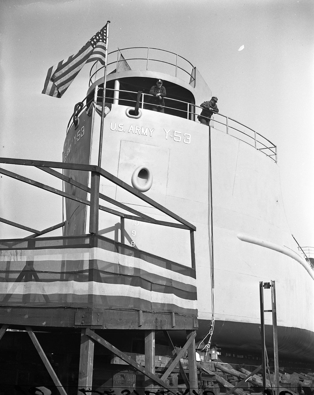 Yard workers on bow of Y 53 awaiting her launching, 12 October 1944. Mathis Collection, Independence Seaport Museum, Philadelphia, PA |