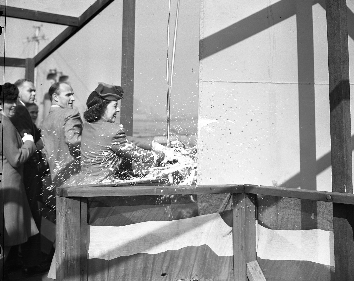 Y 53's sponsor (name unknown) christens the new tanker, 12 October 1944. Mathis Collection, Independence Seaport Museum, Philadelphia, PA |