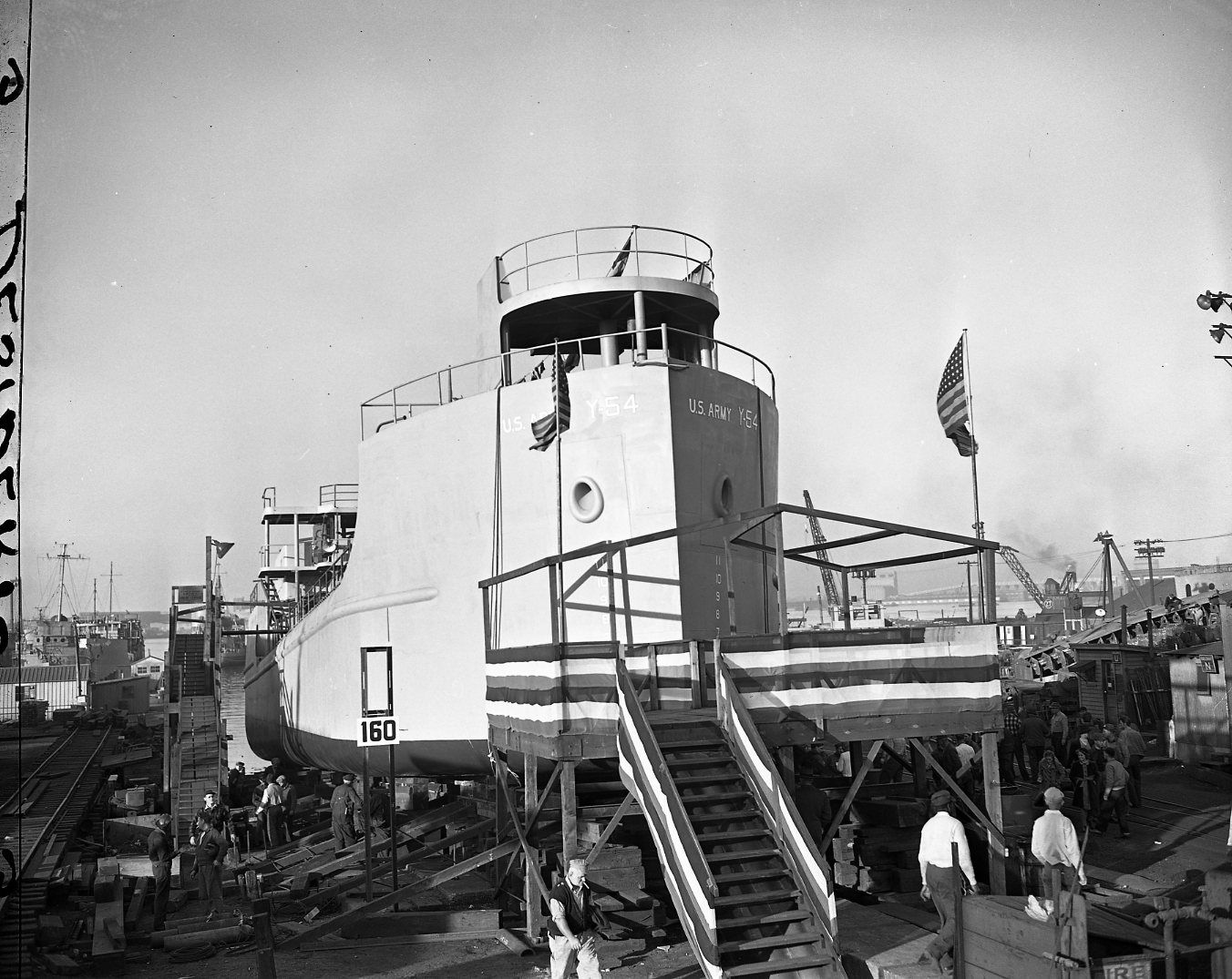 General view of Y 54 on the ways at John H. Mathis Co., the day of her launching, 23 October 1944. Mathis Collection, Independence Seaport Museum, Philadelphia, PA |
