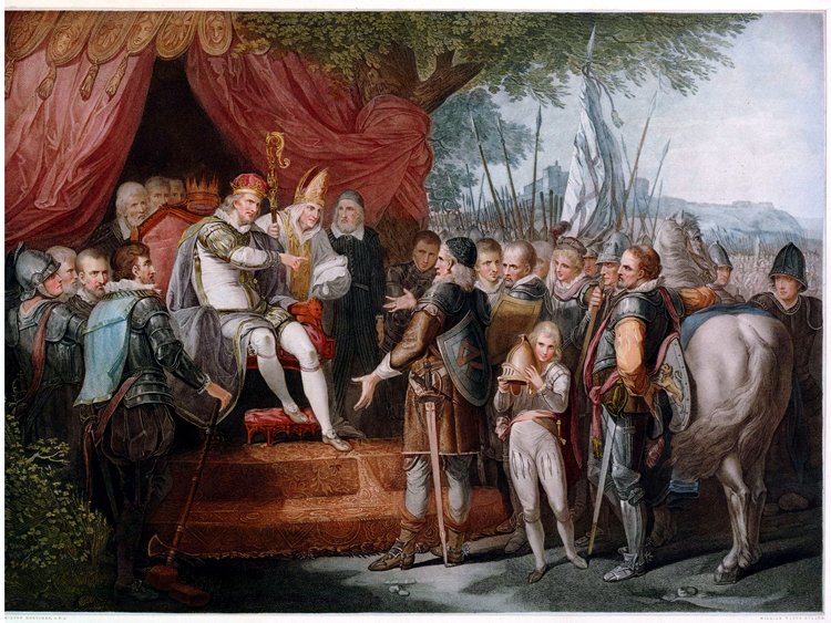 125k | "The ratifying the Magna Charta by King John; King John delivering Magna Carta to the Barons" - This print reproduces a painting by John Hamilton Mortimer (1740-79), exhibited at the Society of Artists in 1776. Imagining the scene of the granting of Magna Carta at Runnymede, Mortimer shows Archbishop Langton (1150-1228) on the point of handing over the charter to Robert fitz Walter (1162-1235), the leader of the rebel barons. |