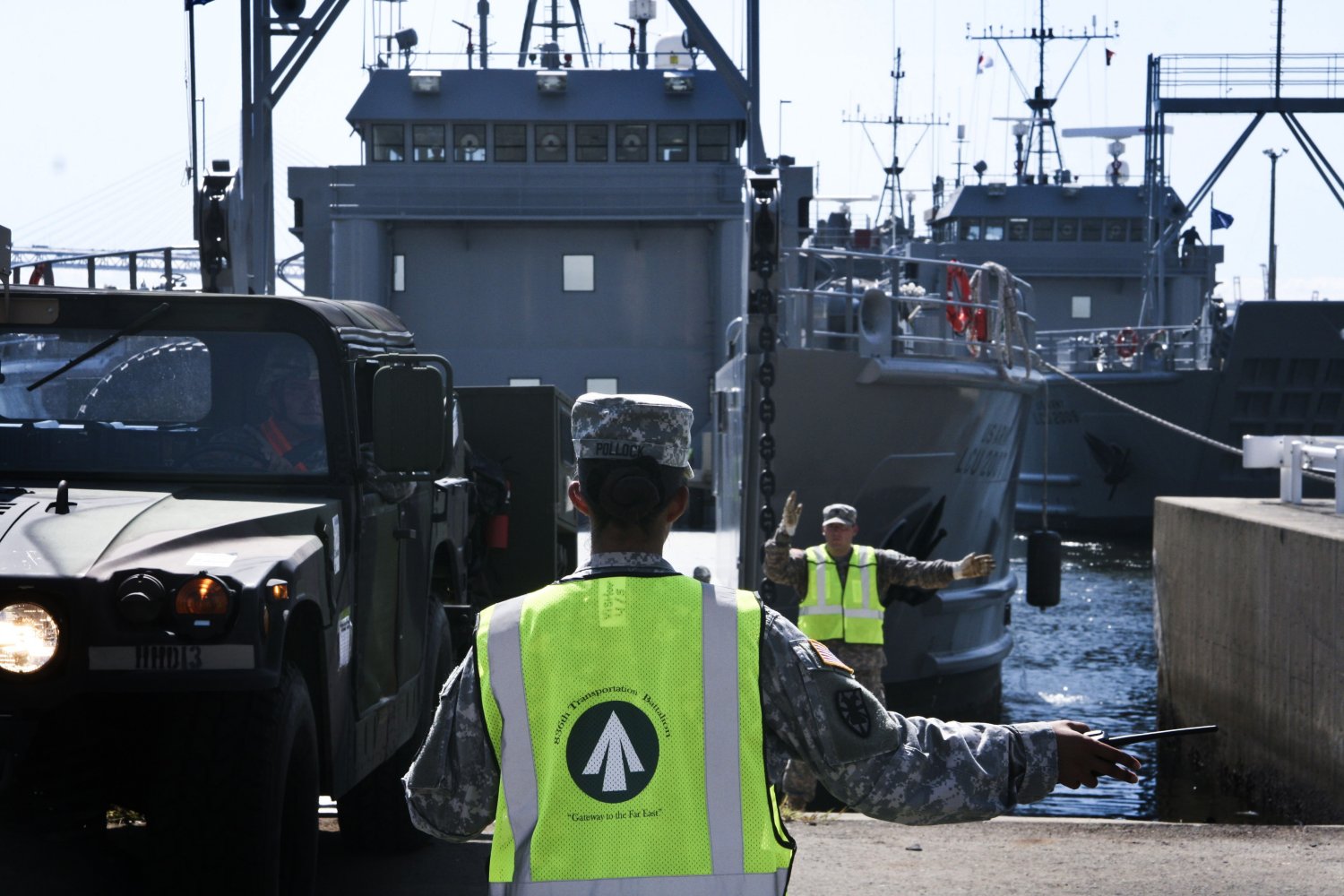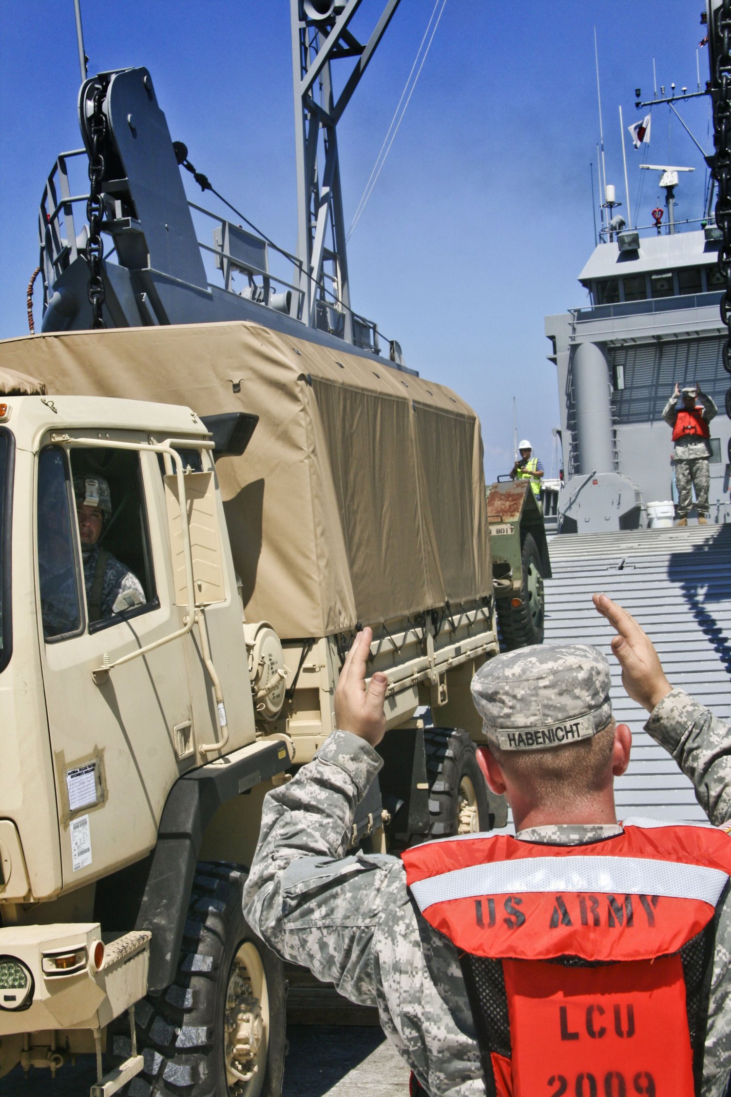 Pfc. Jordan Habenicht, with the Tacoma, Washington-based Army Reserve's 709th Transportation Company, guides a Light Medium Tactical Vehicle (LMTV) onto the deck
