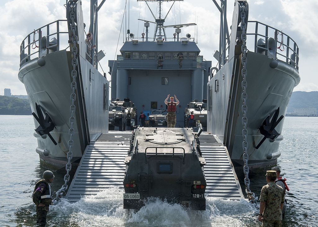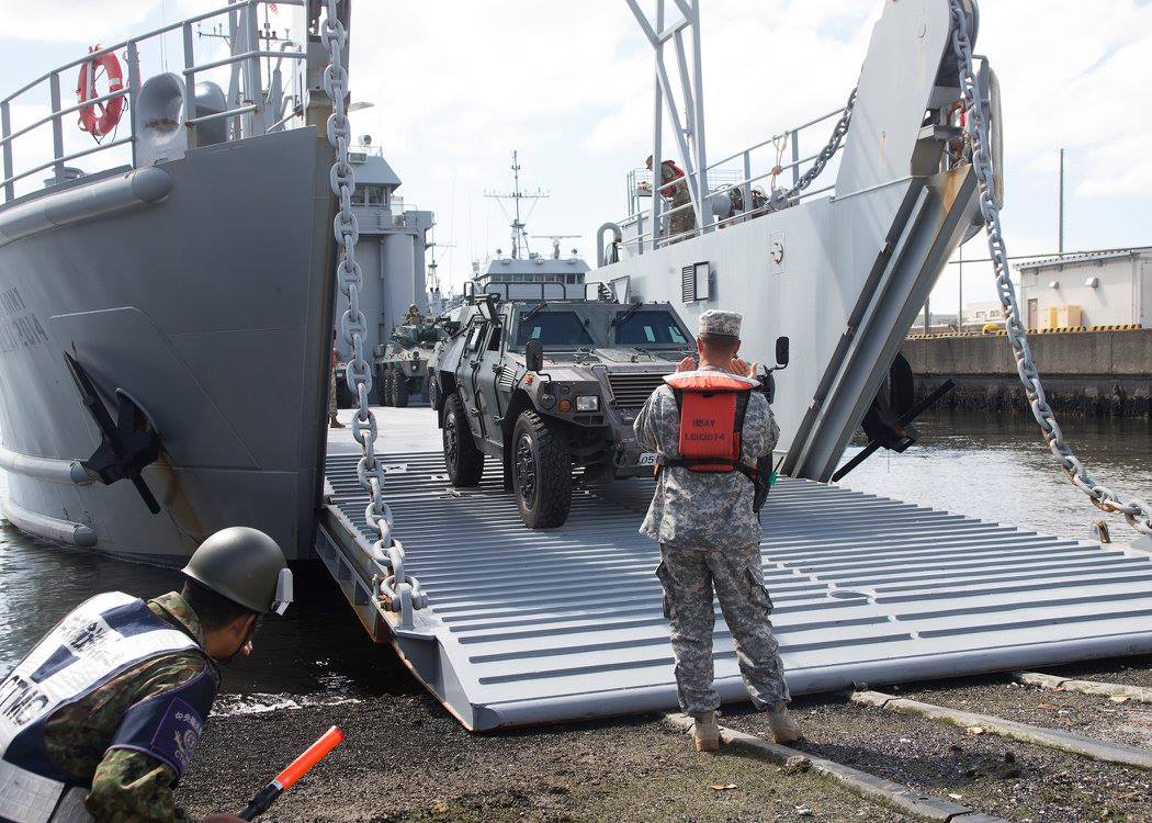 161k | A U.S. Army Soldier signals to the driver of the Japan Ground Self-Defense Force vehicle to advance to unload from USAV Coamo (LCU-2014)