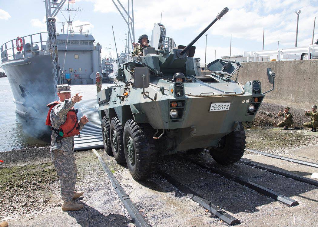 173k | U.S. Army Spc. Michael Breneman signals to a Japan Ground Self Defense Force light armored vehicle during an onload evolution aboard