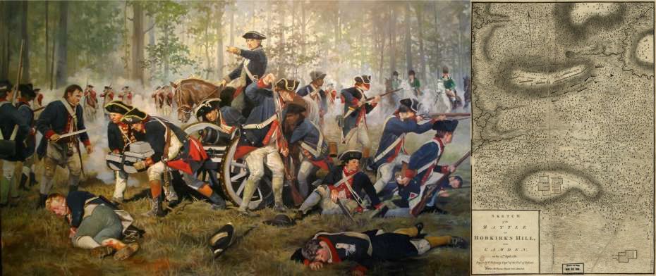 85k | On April 25th, British Colonel Francis Rawdon marched out of Camden, just as Greene had hoped and began to march up the ridge. Rawdon's men marched up the ridge in a narrow formation, allowing Greene to attack from the front and both sides and gain an early advantage that inflicted heavy casualties on the British. Soon after the fight began, however, several of the key American leaders were shot, causing their units to break apart and flee. Rawdon took this advantage and charged up the hill, causing Greene to withdraw in full retreat, even though he had a much larger force. The Americans lost 270 killed, captured, wounded or missing, while the British lost 261. Photo - Revolutionary War and Beyond - Painting by Pamela Patrick White of the Battle of Hobkirk's Hill Map - The American Revolution in South Carolina - Sketch of the Battle of Hobkirk's hill by CAPT. Charles Vallancey of the Volunteers of Ireland |