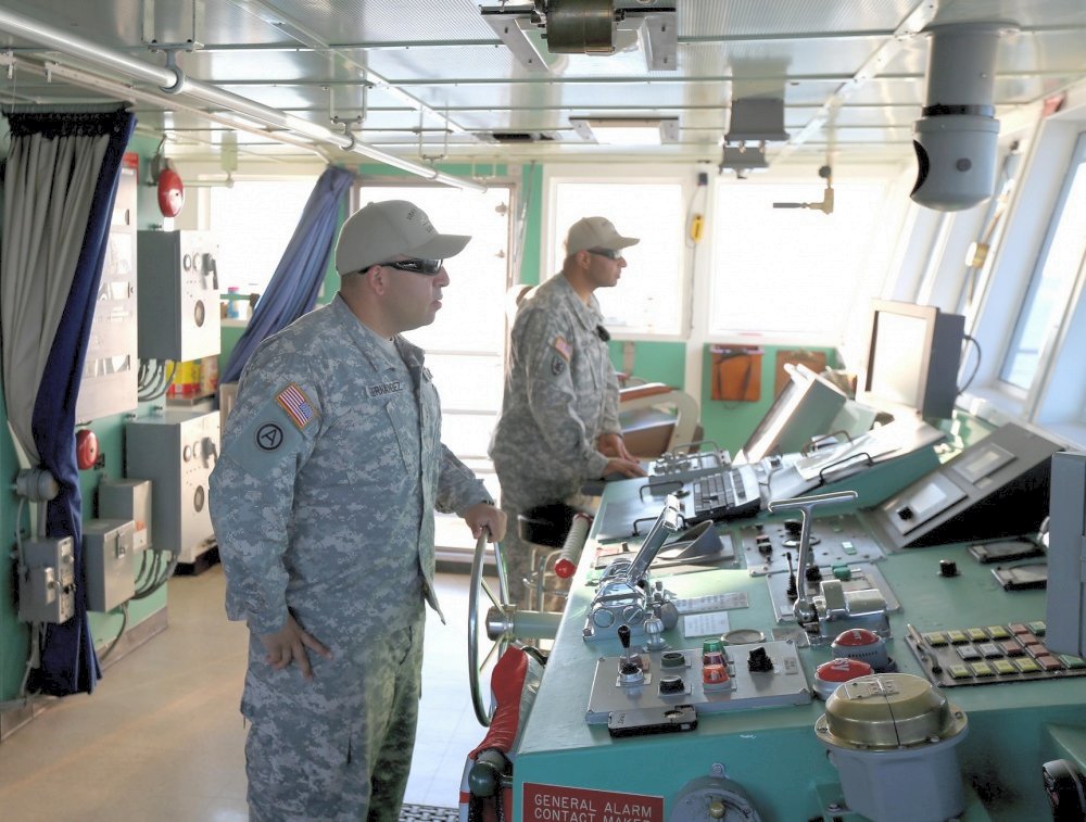 controls the helm of the landing craft during a Joint Logistics Over the Shore (JLOTS) exercise with Joint Task Force Civil Support, 14 August 2014. JLOTS is the process of loading and