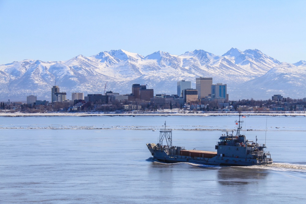 past the City of Anchorage, Alaska, 3 April 2014. The 481st is participating in Joint Logistics Over-the-Shore (JLOTS) Operations, the exercise coincides with the 50th
