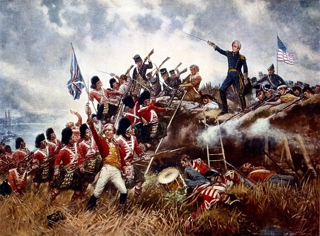 252k | General Andrew Jackson stands on the parapet of his makeshift defenses as his troops repulse attacking Highlanders. (The Highlanders are incorrectly depicted wearing kilts and feather bonnets as the 93rd Highlanders for this campaign had been ordered to wear tartan trousers and plain bonnets - in fact the uniforms shown are more Victorian in style than Georgian. See, "Historical Records of the 93rd Sutherland Highlanders", Roderick Hamilton Burgoyne, London, 1883. (Library of Congress Reproduction of painting by E. Percy Moran. LC-USZC2-3796 (color film copy slide) |