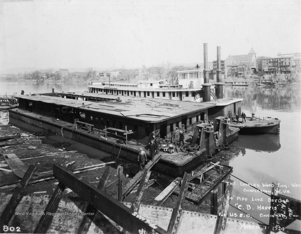 C.B. Harris after launching under construction at Charles Ward Engineering Works, Charleston, W.V., 1 March 1924, note steamer alongside.