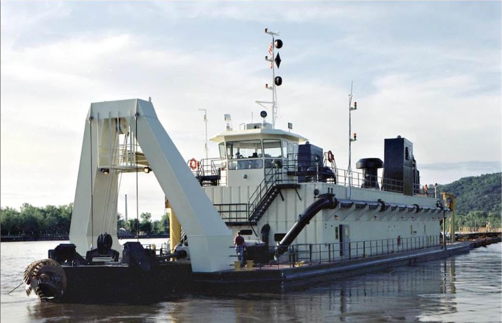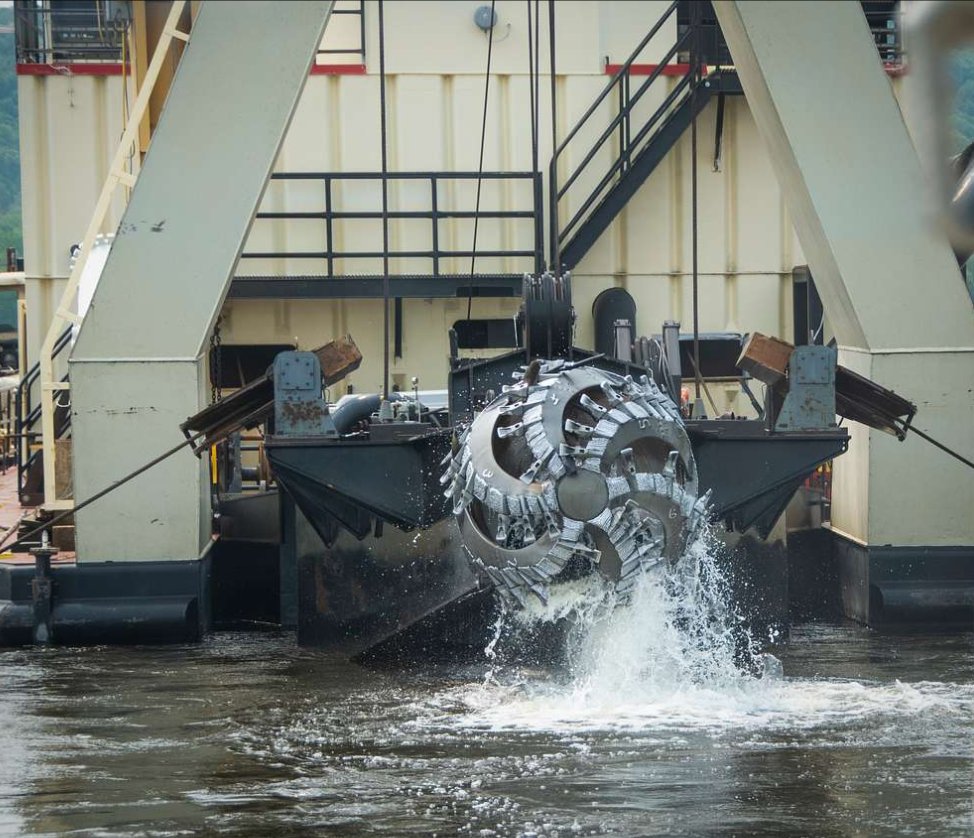 The cutter heard of US Army Corps of Engineers Dredge USACE Goetz acts like a blender, mixing material on the Mississippi River-bed to create a