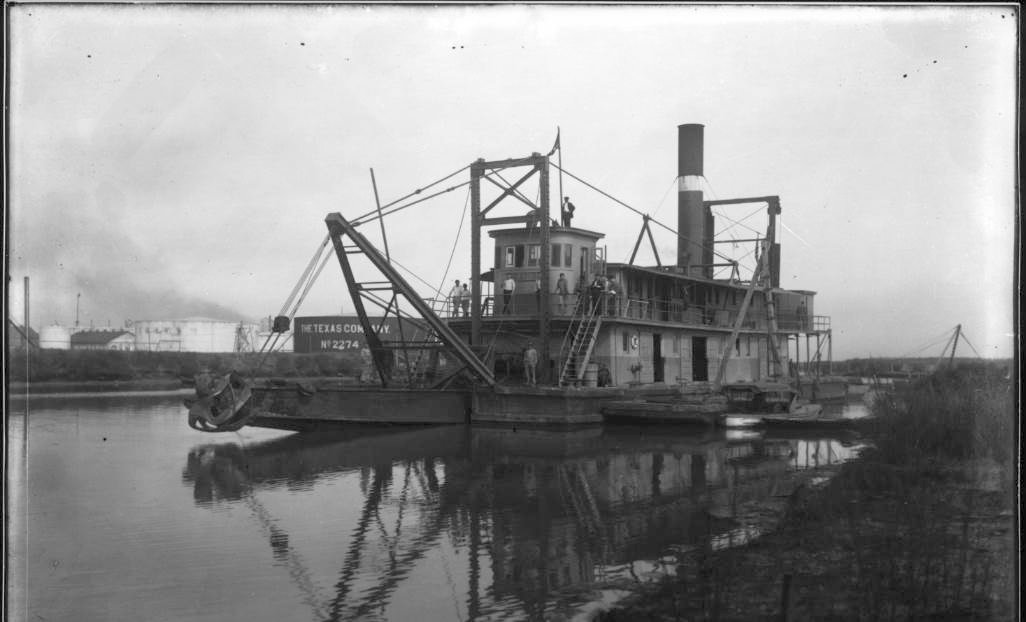 72k USED Dredge Orange cutterhead out of the water while working on the Neches River in January 1913,