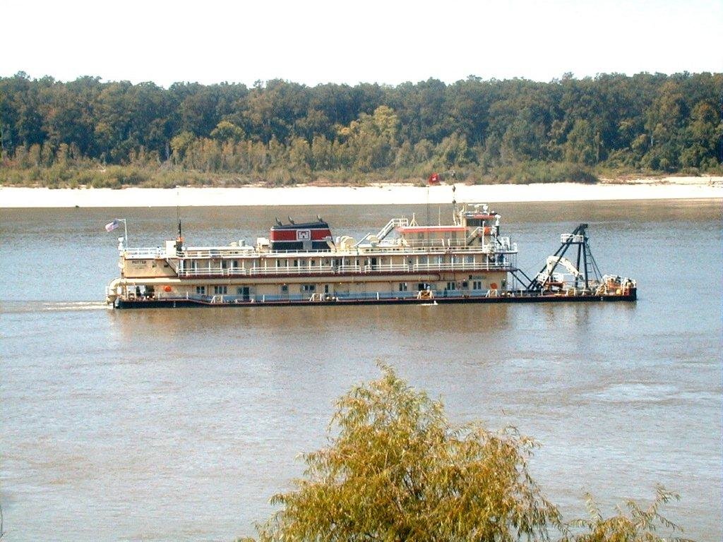 107k | Flexible floating dredge pipe connects to USACE Dredge Potter while dredging the Mississippi River, date unknown.