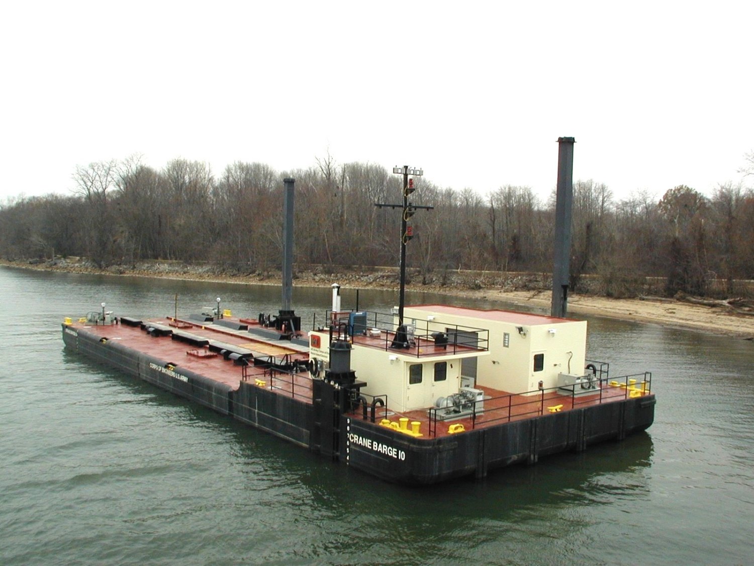 USACE Crane Barge DB-10 stationary in the middle of a river with one spud down, date and location unknown
