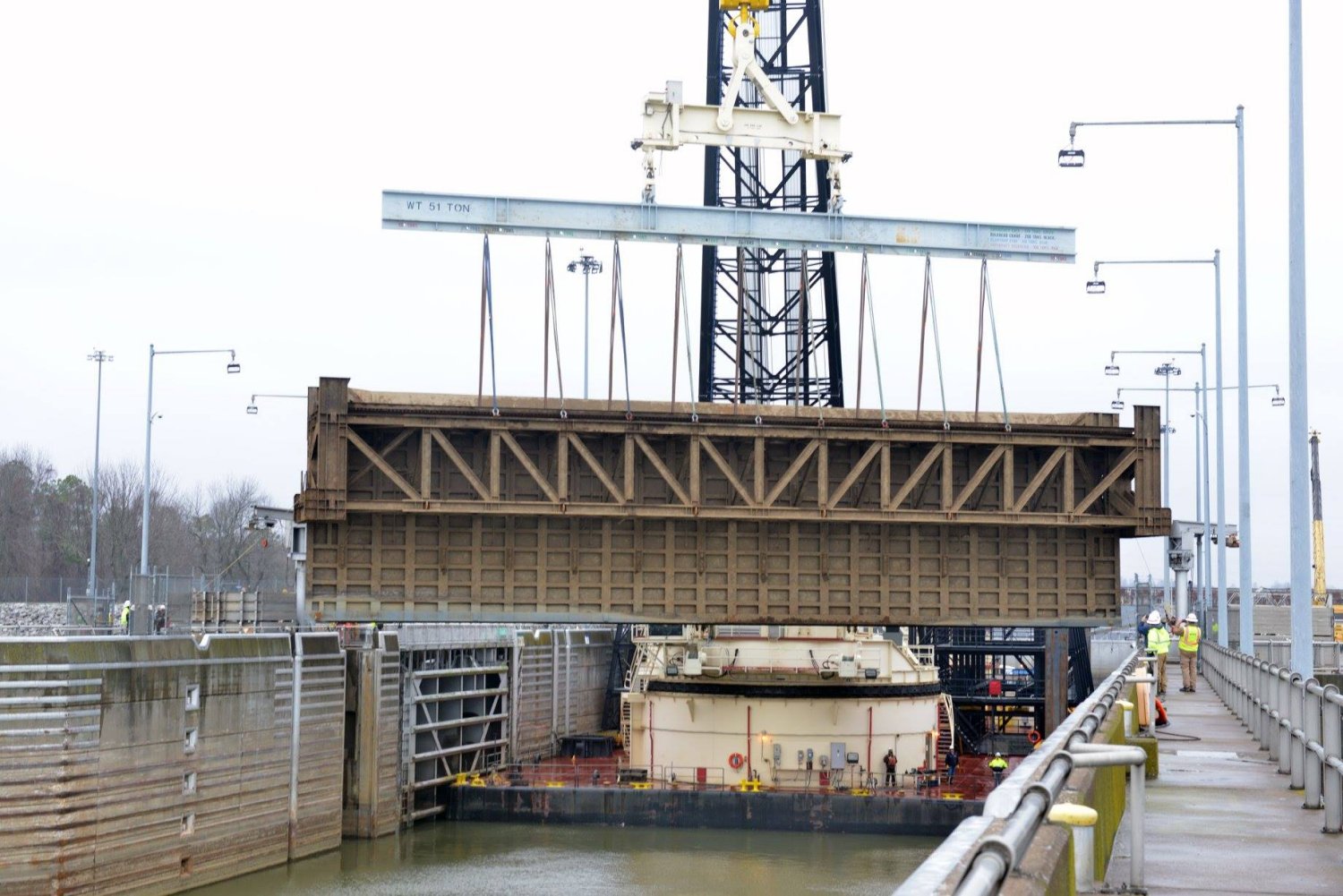 Army Corps of Engineers uses the USACE Floating crane Henry M. Shreve to remove an emergency lift gate from the Lake Barkley Lock in Grand Rivers, KY., 29 January 2020.