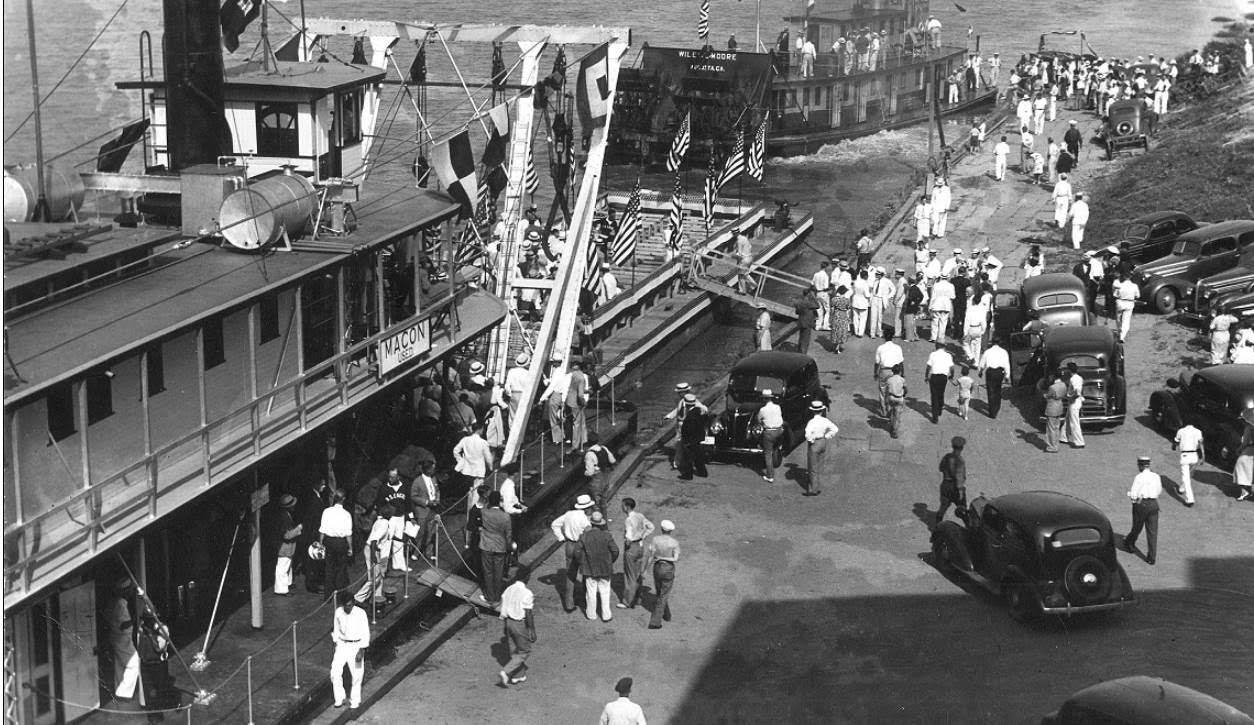 226k USED Macon moored pierside at Savannah or Augusta GA. on the Savannah River, circa 1930s. The steamer Wiley L. Moore, is docking forward of Macon. John Spivey