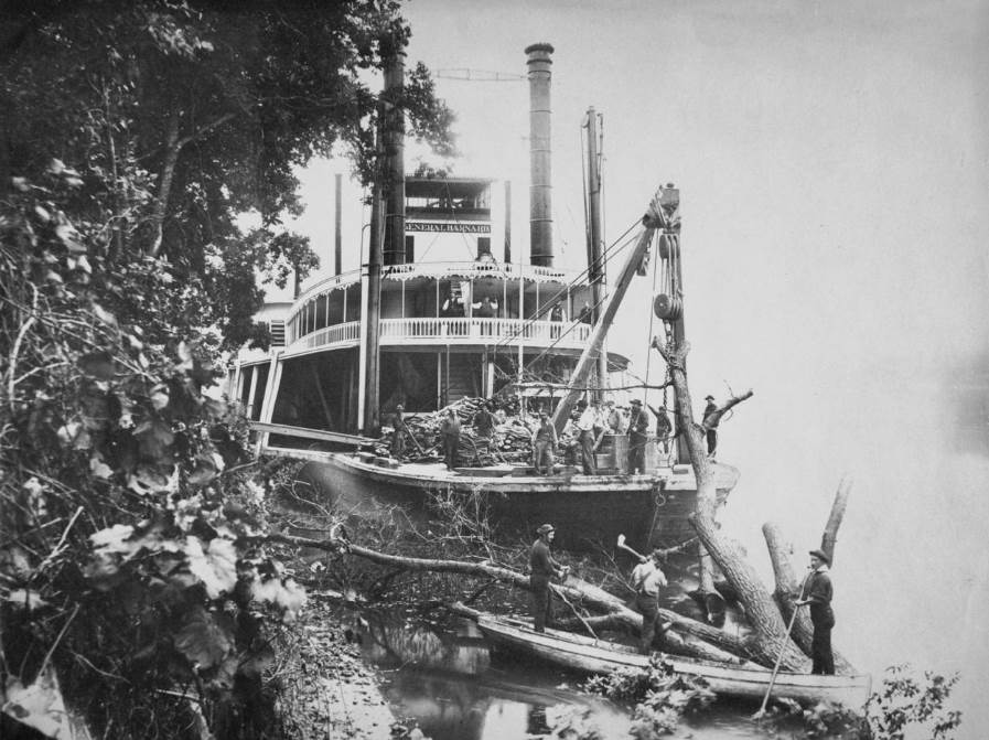 USED Snagboat General Barnard snagboat operations; crew chopping up a tree that they had snagged from the river, date and location unknown.