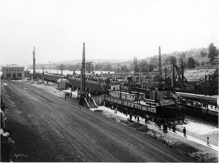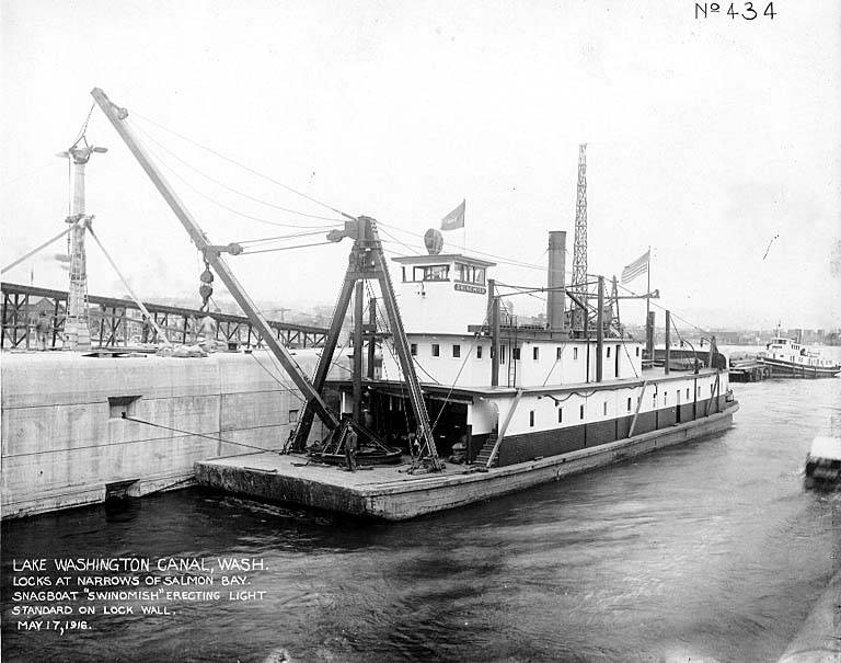 71k | Lake Washington Canal, WA. Locks at the narrows of Salmon Bay. The stern wheel snagboat USED Swinowmish erecting light standard on lock wall, 17 May 1916.