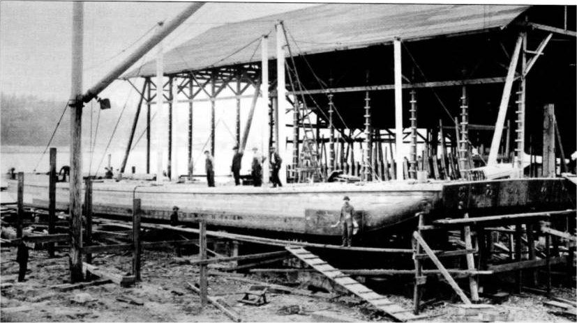 92k | Original wood hull of USED Snagboat Swinomish under construction, 1 October 1914, at Winslow, WA..