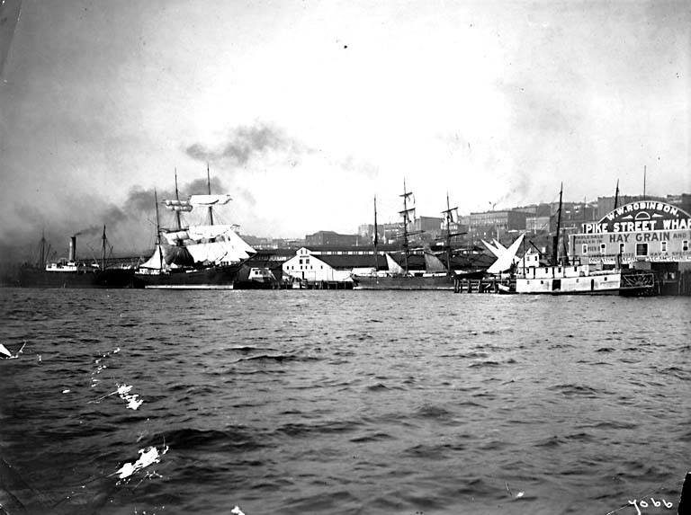 Note Pike Street Wharf at right, still extant as Pier 59, was originally built in 1904 by Ainsworth & Dunn. An early major tenant was Willis Wilbur Robinson, who ran sternwheelers of hay