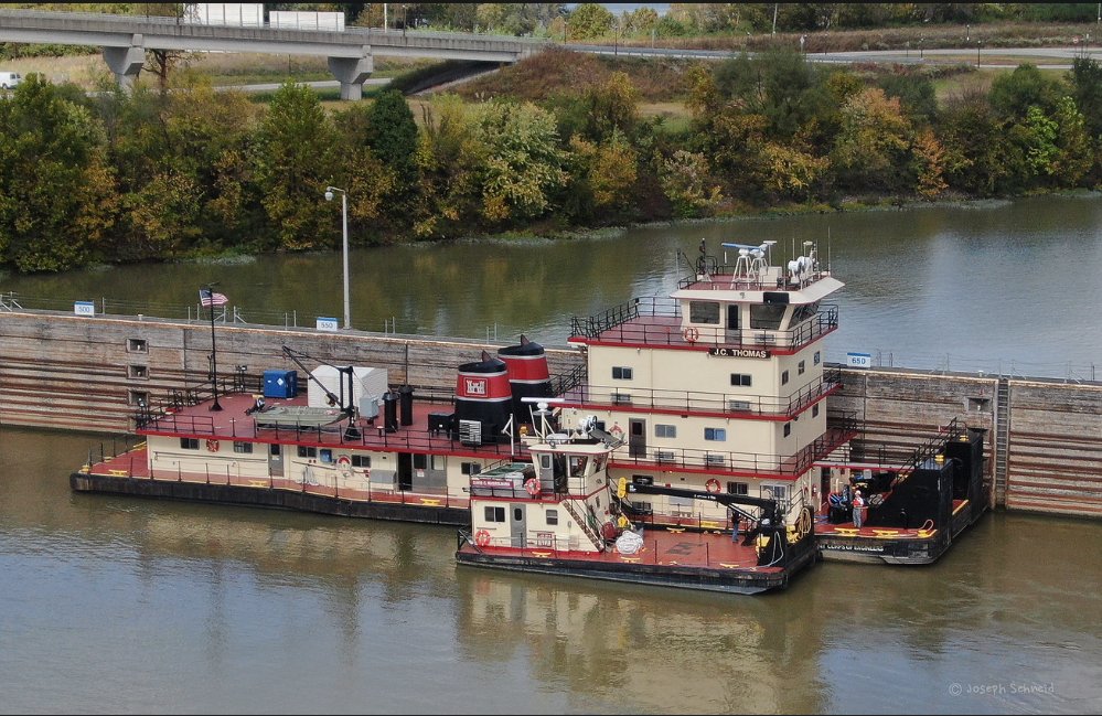 192k | USACE Debris Collecter David C. Russelburg and USACE Towboat J.C. Thomas on the north chamber guidewall of the McAlpine Locks, Louisville, KY., date unknown