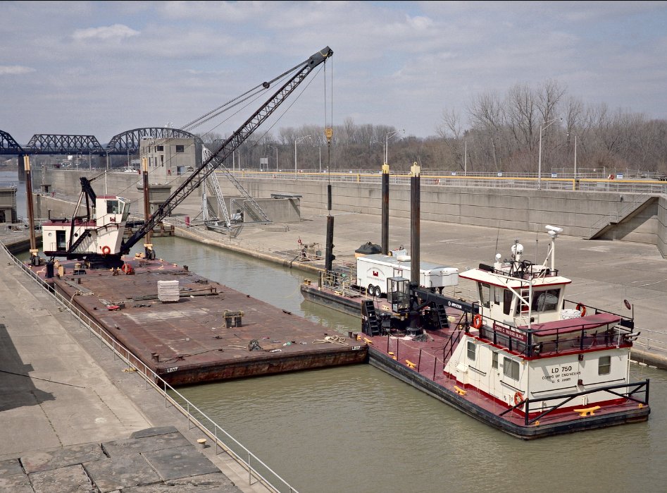 168k | USACE Debris Collecter David C. Russelburg and floating crane LD-37 in 360-foot lock. Ohio River mile 607, Louisville, KY. McAlpine Locks